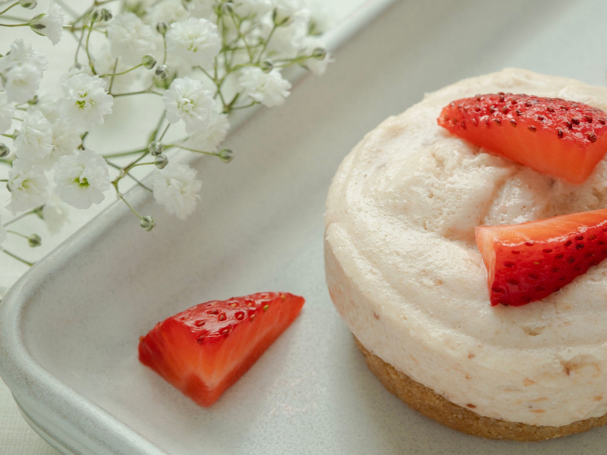 A strawberry-flavored cheesecake with a buttery classic crust, topped with a swirl of whipped cream for the perfect sweet finish.
